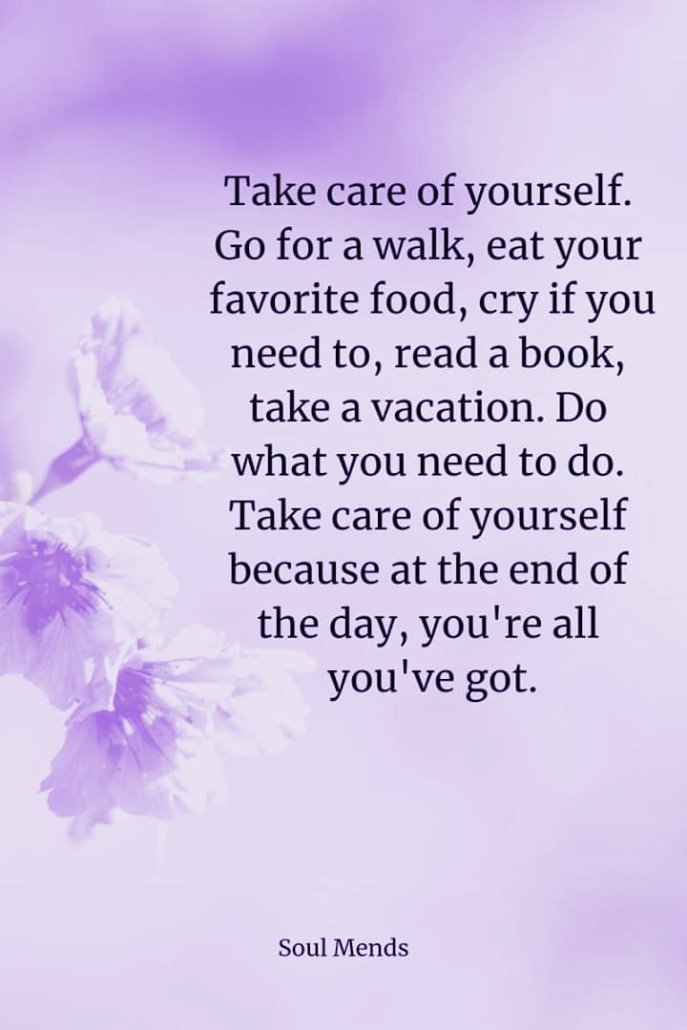 💜Take Care Of Yourself💜 Standard Image Credit: Soul Mends Share this: Click to share on X (Opens in new window) X Click to share on Facebook (Opens in new window) Facebook More Click to share on LinkedIn (Opens in new window) LinkedIn Like Loading... Related
