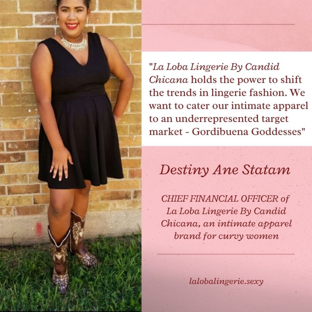 Destiny Ane Statam will serve as the Chief Financial Officer of La Loba Lingerie. Destiny will be getting her certifications in Bookkeeping, and Accounting at the Goodwill Leadership Academy. The accounting cert also comes with a transferable college credit.